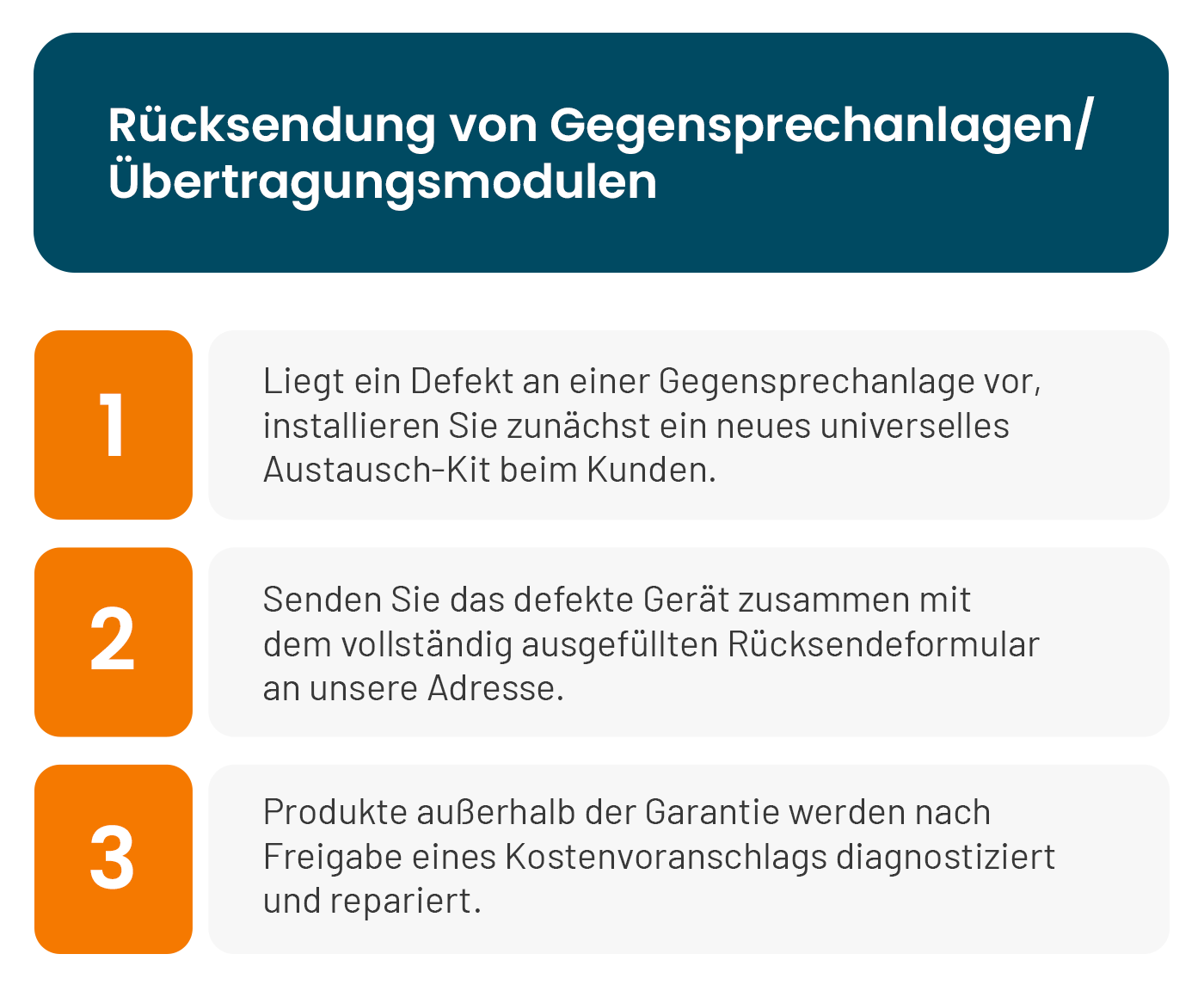 Befolgen Sie diese Schritte, wenn Ihre Gegensprechanlage oder Ihr Übertragungsmodul vom Support für eine Reparatur als geeignet erachtet wurde: